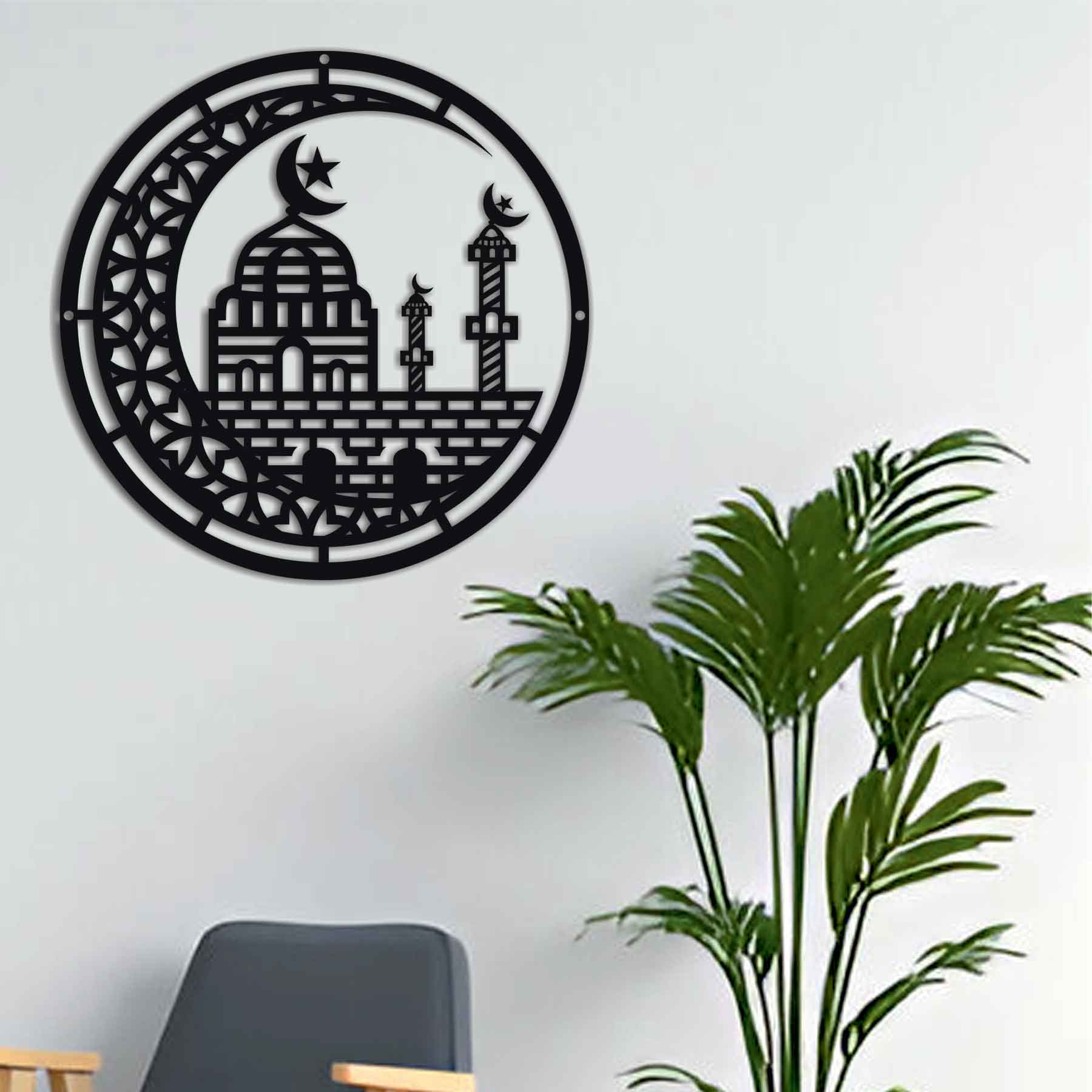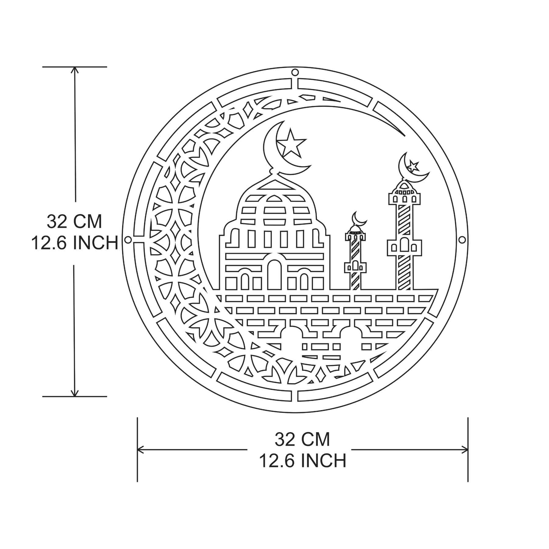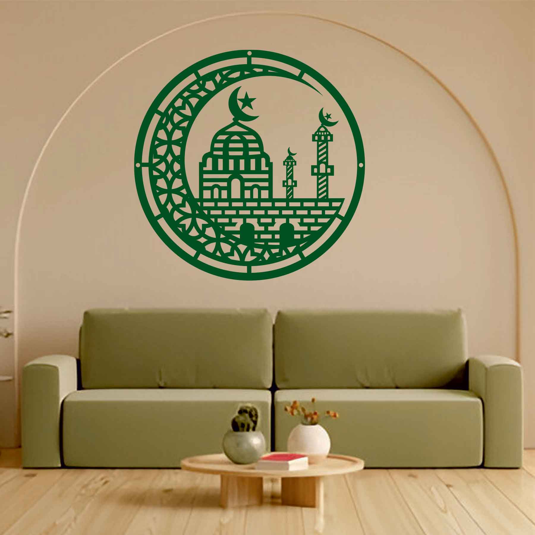 Moon Mosque Bordered STANDERD  Metal Home Decor Wall Art By Best 'O' Craft — Where Devotion Meets Design A Spiritual Centerpiece Inspired by Divine Serenity Elevate your living space with the Moon Mosque Bordered PREMIUM Metal Wall Art, a magnificent representation of Islamic architecture enveloped in the divine symbolism of the moon and star. Designed with spiritual reverence and artistic finesse, this masterpiece is crafted to infuse your home with elegance, tranquility, and an enduring sense of faith. This unique piece features a mosque (masjid) beautifully encased within a crescent moon and star, symbolic of peace, divine guidance, and unity in Islamic tradition. Framed with a detailed circular border and cut with CNC precision, this artwork is not just a decorative item—it is a spiritual experience. Design & Symbolism The mosque silhouette under the moon and star represents: