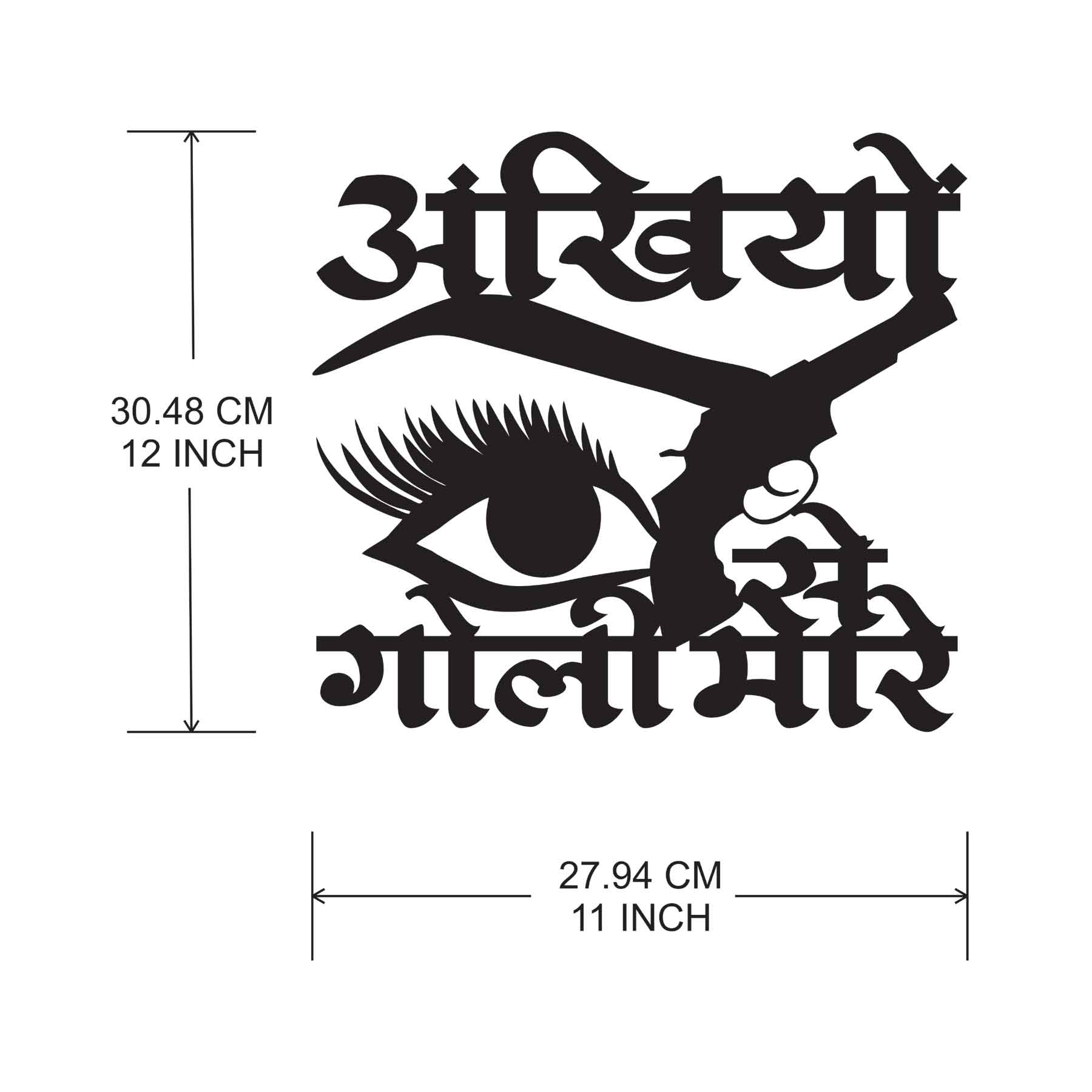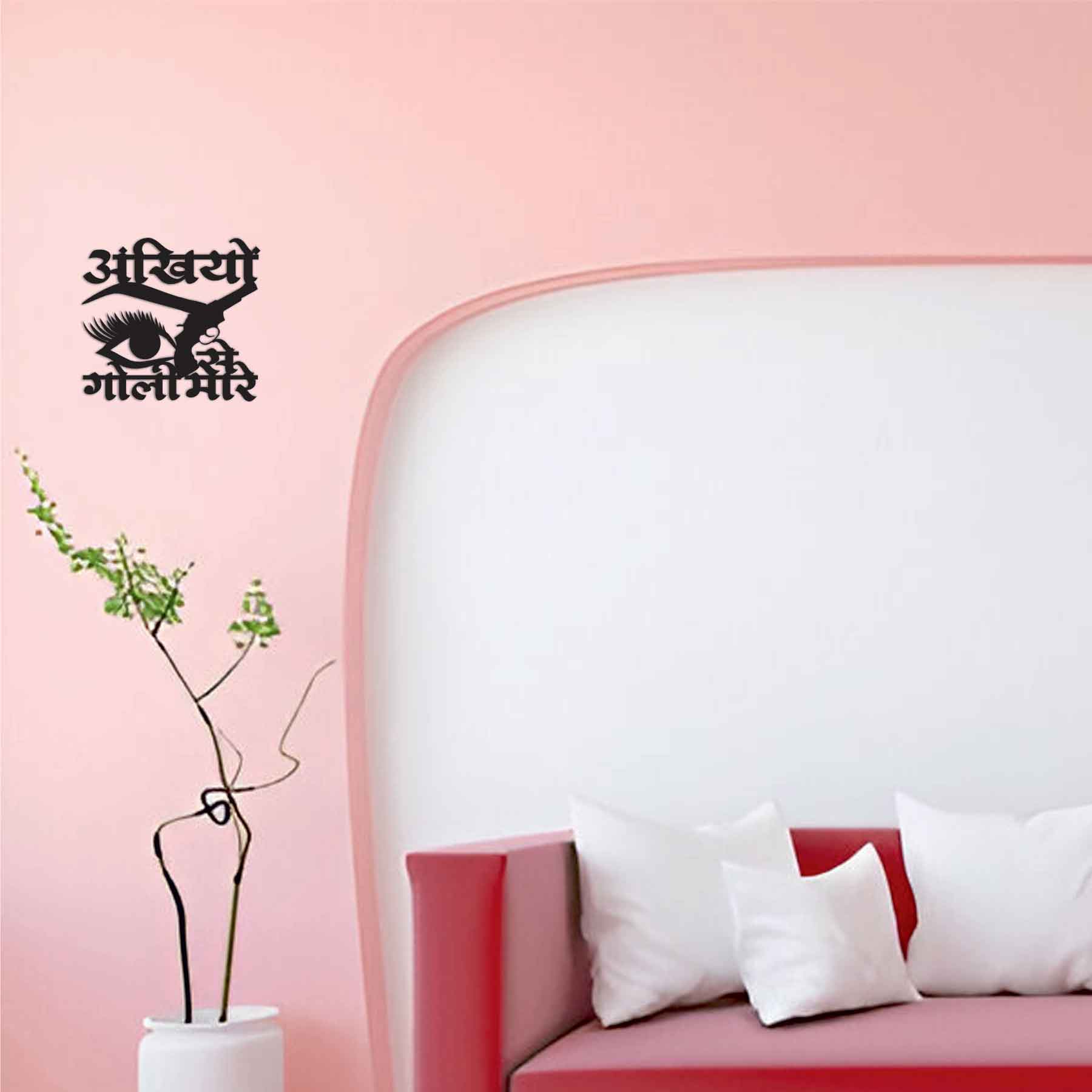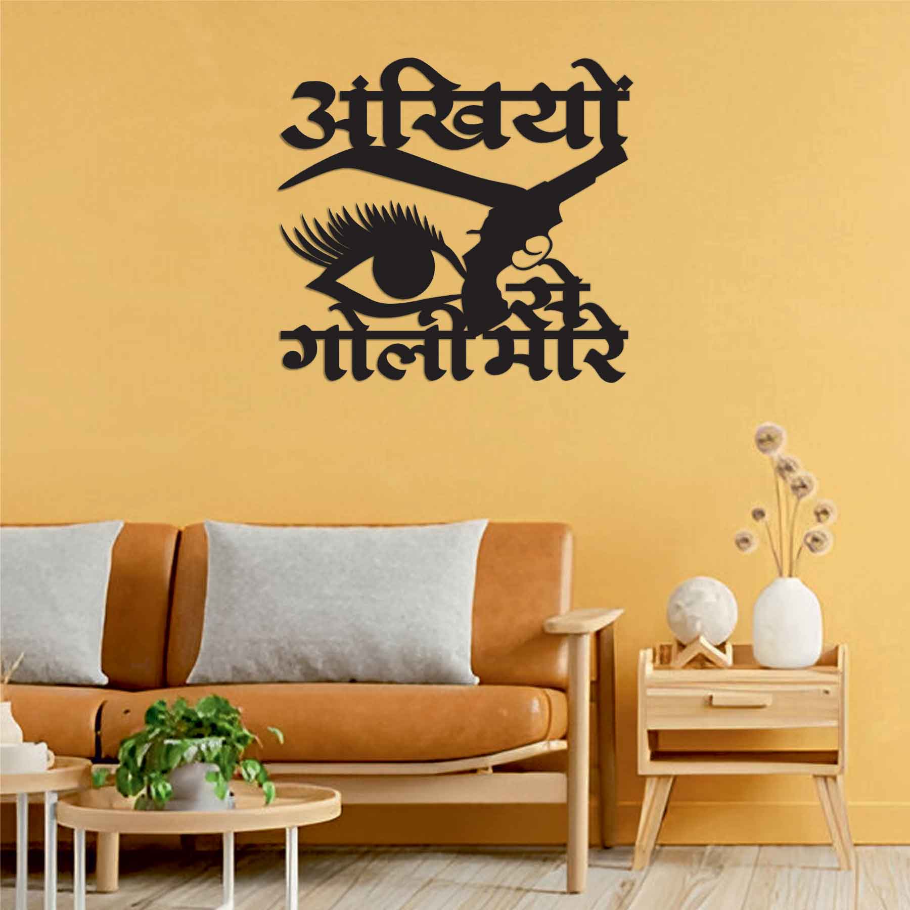 black finish, and eye-catching graphics of a stylized eye and pistol, this wall art turns the iconic line “Ankhiyon Se Goli Mare” into a captivating visual centerpiece. Whether you're a movie buff, pop-art lover, or someone who appreciates a bit of spice in your interior style—this piece hits the mark.