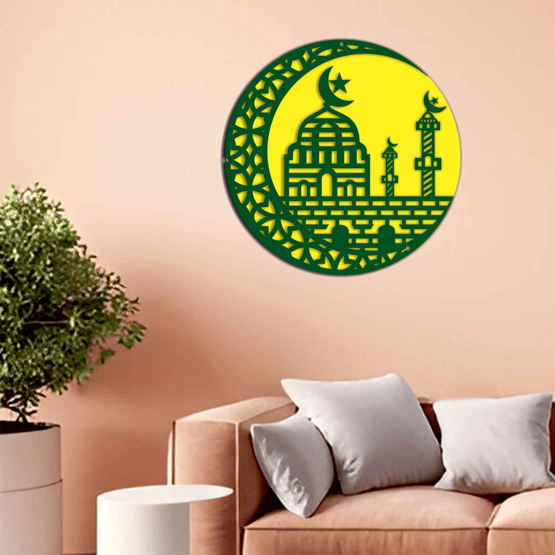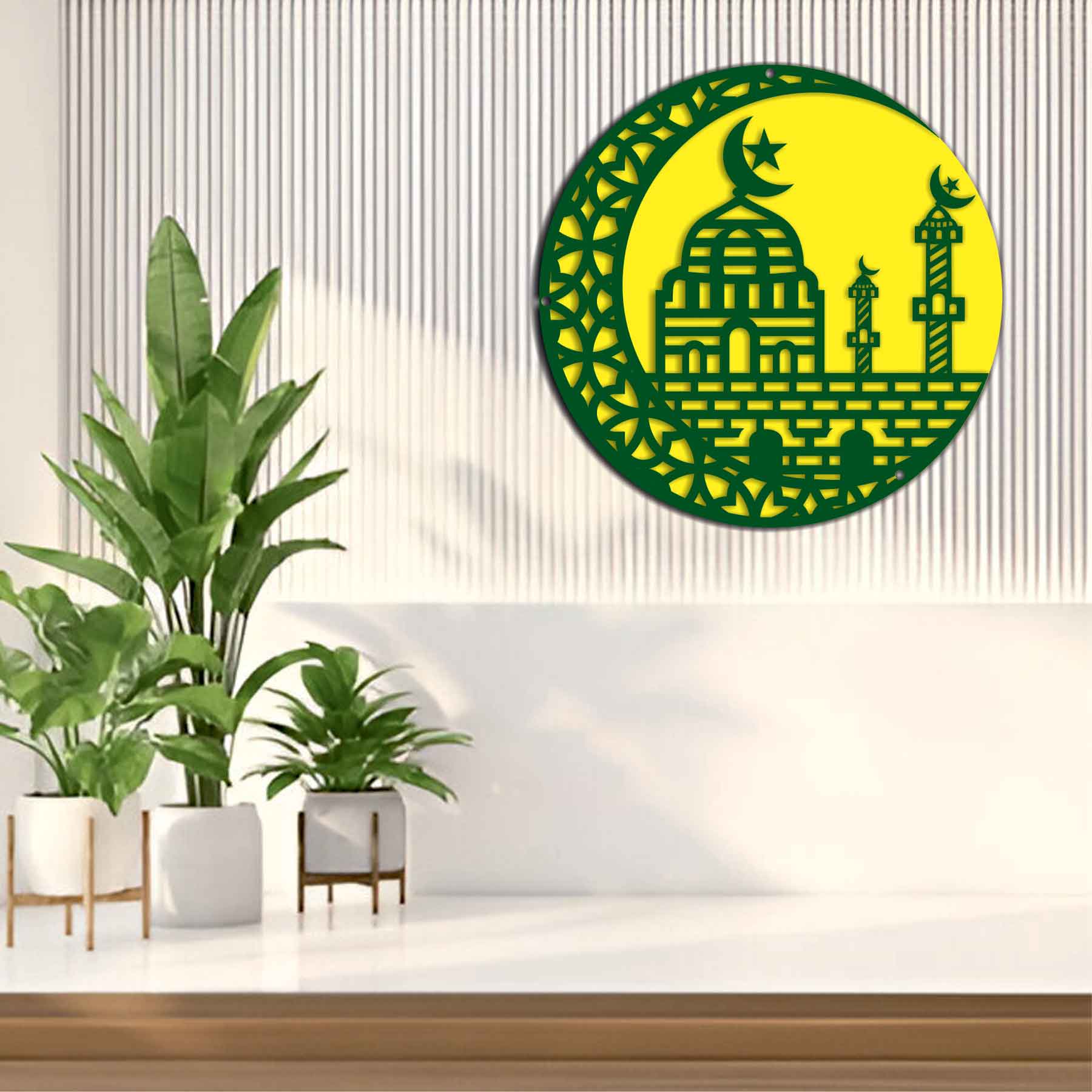 MOON MOSQUE PREMIUM METAL HOME DECOR WALL ART "Where Celestial Beauty Meets Sacred Serenity" By Best 'O' Craft | Designed & Made in India 🕌 Product Overview Immerse your living space in a harmonious fusion of spiritual symbolism and contemporary elegance with the MOON MOSQUE PREMIUM METAL HOME DECOR WALL ART by Best 'O' Craft. Featuring a laser-precise CNC-cut silhouette of a mosque (masjid) nestled within a radiant crescent moon and crowned with a guiding star, this artwork embodies the sacred essence of Islamic architecture and celestial divinity. This piece is not just home decor — it’s a spiritual emblem of peace, devotion, and divine light, ideal for those who value faith-based artistry and aesthetic excellence. Whether placed in a living room, prayer space, hallway, or meditation nook, it becomes a daily visual reminder of faith, tranquility, and sacred purpose. 🌙 Spiritual Symbolism The crescent moon and star have long symbolized divine guidance and light in the Islamic tradition, while the mosque silhouette within represents a place of worship, unity, and connection with the Almighty. Together, they convey: